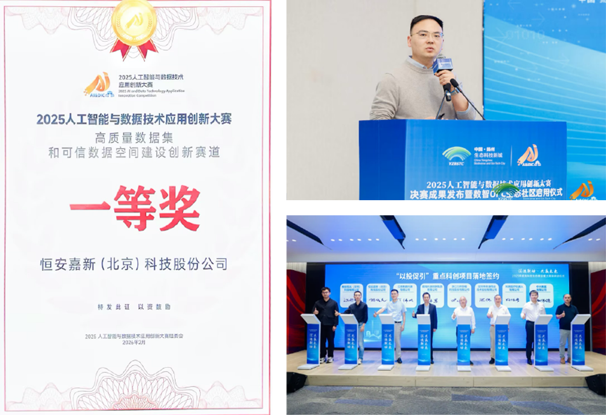 2026 年2月,出席人工智能与数据技术应用创新大赛成果发布大会,《恒安嘉新基于警银网通协同的 AI+ 反诈数据标签体系高质量数据集建设应用案例》斩获大赛高质量数据集和可信数据空间建设创新赛道一等奖,完成恒安嘉新扬州人工智能安全中心项目战略签约